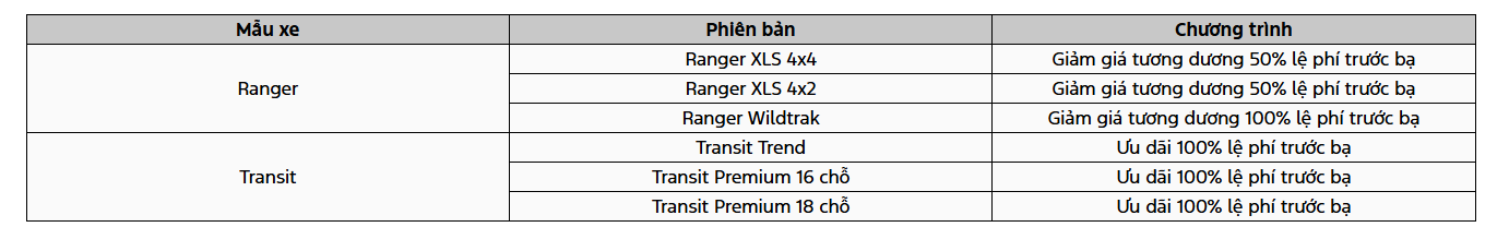 Lưu ý: Mức hỗ trợ lệ phí trước bạ được căn cứ trên Giá bán lẻ Khuyến nghị của Ford Việt Nam và mức thuế 6% cho xe bán tải, 2% cho xe thương mại.