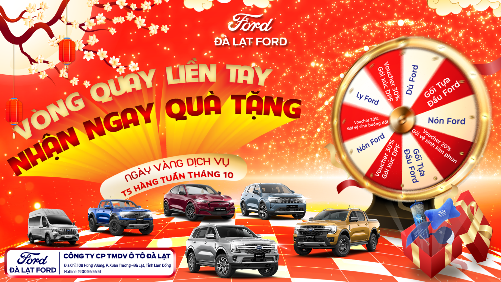 Đà Lạt Ford mang đến chương trình ưu đãi lớn 9.9 NGÀY ĐÔI - Ưu đãi kép từ 09/09 đến 30/09/2024 với cơ hội mua xe Ford Territory, Everest, Ranger, Explorer cùng nhiều phần quà giá trị. Ký hợp đồng từ 09/09 đến 19/09/2024 để nhận mã quay thưởng tham gia rút thăm vào 21/09/2024, phát trực tiếp trên fanpage Ford Việt Nam. Đừng bỏ lỡ cơ hội sở hữu xe Ford với giá ưu đãi và nhận quà hấp dẫn ngay trong tháng 9 này!